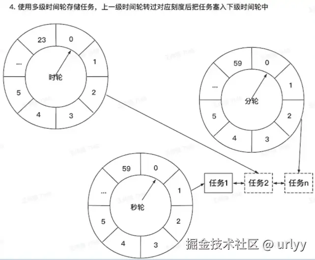 比如一个任务要在每天的02:01:05执行,任务先放在时轮的第二格,每过一个小时时轮走一格,当到达2时将该任务放在分轮的第一格,依次类推,直到秒轮走到他上面之后,执行任务。
