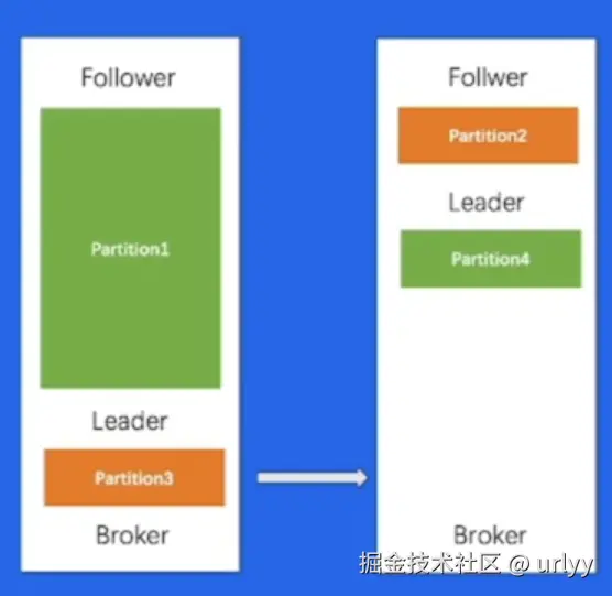 对于每个Partition中的多个Replica,分为主从,读写时只向Leader Replica,而Follwer是不断同步Leader的数据,以便在Follwer所在的节点(Replica可以分布在不同Broker、不同机器上)故障时,替代Leader继续承接业务。当一个Partition的Leader故障时,Controller就会发起选举,从该Partition中的所有Followr中选举出一个新的Leader。