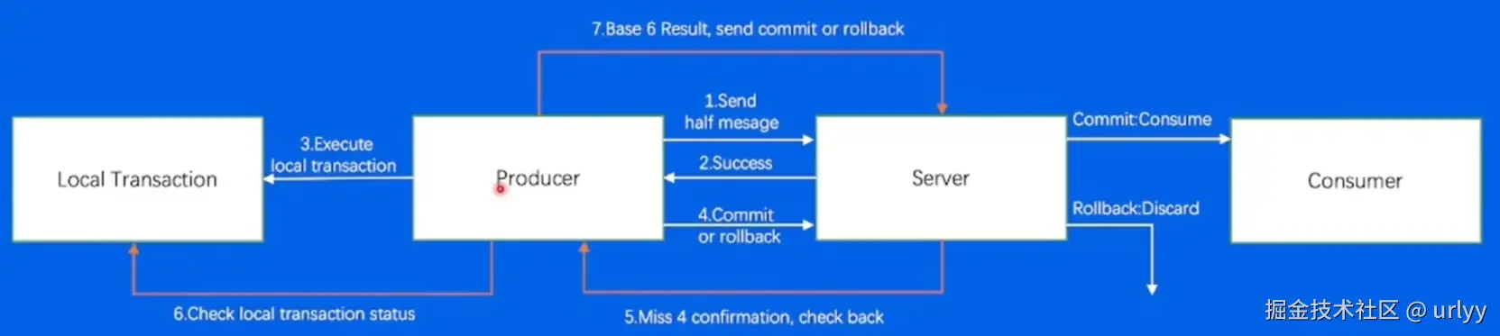 本质上是两阶段提交。先告诉Broker我要提交了(让他等着接下来的Confirm消息),然后在Producer这边库存-1(本地事务),再通知Broker可以发送这个消息给consumer了。异常情况就是Broker意外没收到Producer的通知,就会主动通知Producer重发下本地事务处理结果。这样就保证了本地事务和消息处理是在一个分布式事务中。
